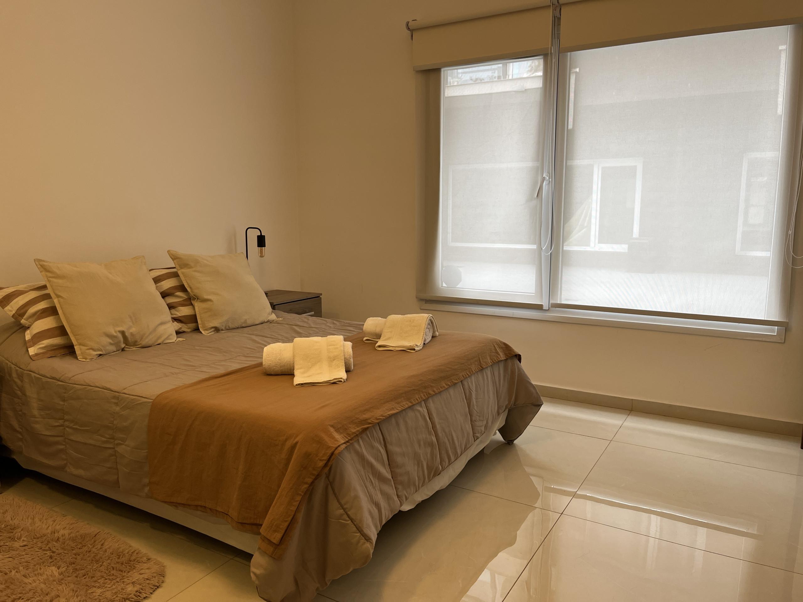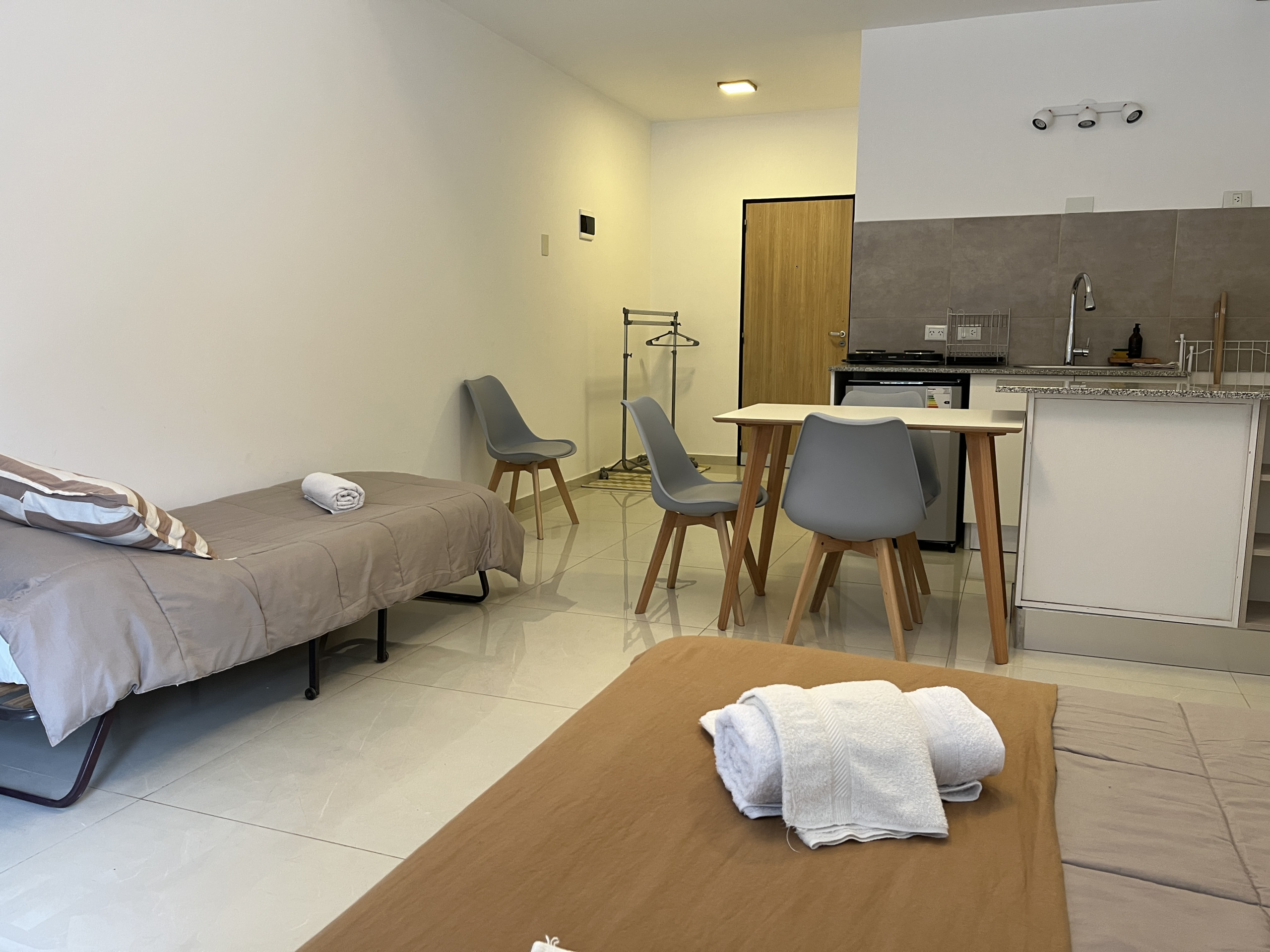 El departamento cuenta con una cama matrimonial y una cama individual, ideal para parejas o pequeños grupos. Dispone de cochera propia, TV Smart, wifi de alta velocidad y cocina completamente equipada con todo lo necesario para cocinar y disfrutar como en casa.