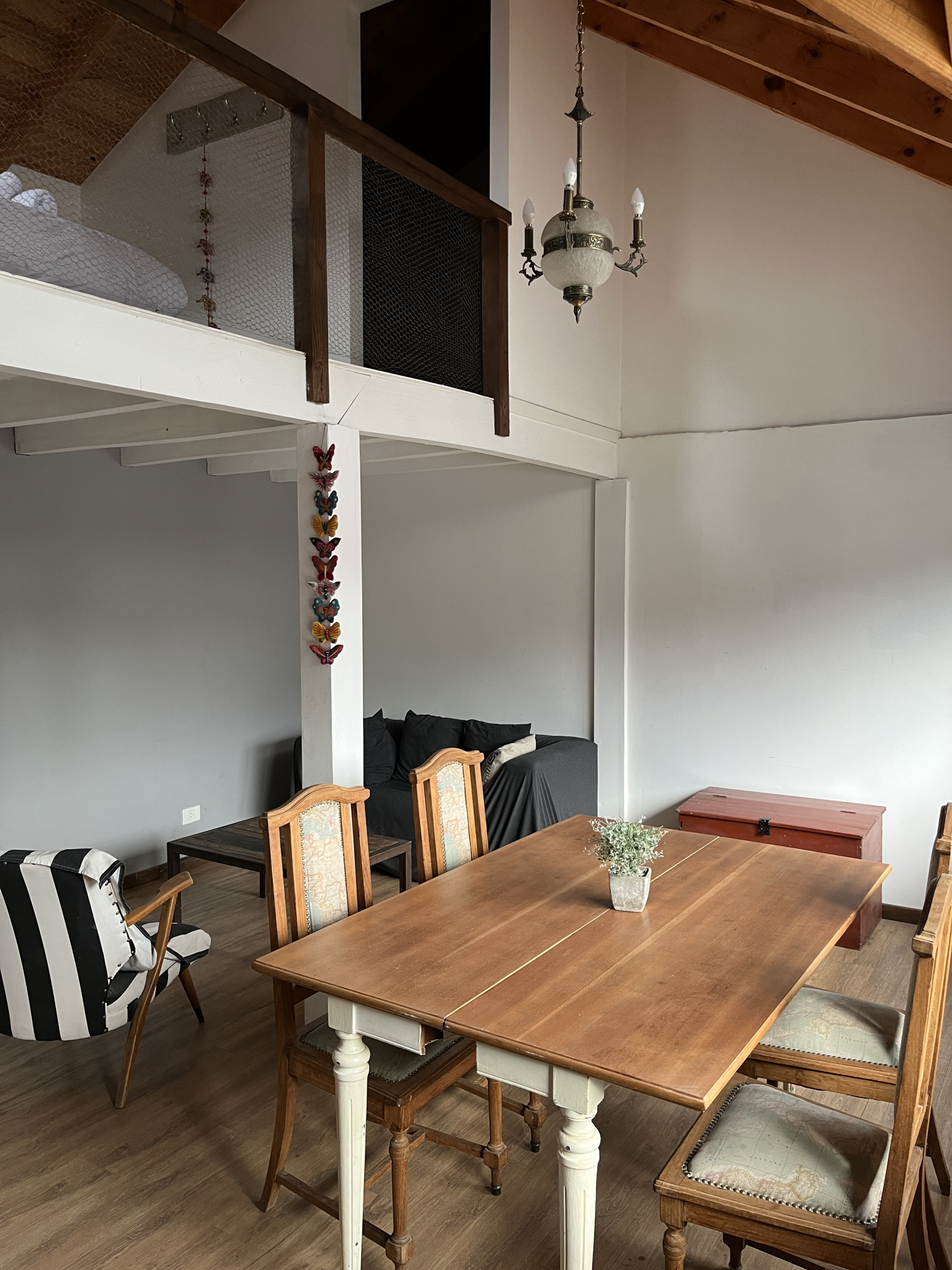 Con capacidad para cuatro personas, este departamento de dos plantas tipo loft ofrece un espacio cómodo y funcional. En la planta baja se encuentra un living-comedor con cocina integrada totalmente equipada, un baño con ducha y dos camas individuales, ideal para niños o amigos. En la planta alta, el dormitorio principal ofrece una cama matrimonial y un ambiente tranquilo para descansar.