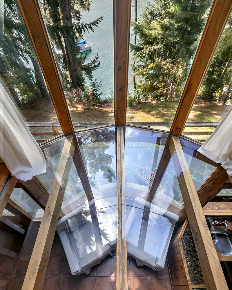 La cabaña con capacidad para 5 personas está distribuida en tres niveles. Al ingresar, te recibe un amplio comedor y terraza con vistas al lago. La cocina integrada está equipada con microondas, heladera y pava eléctrica. En el nivel inferior, el dormitorio principal cuenta con cama matrimonial y acceso a un jacuzzi privado. El último nivel ofrece una habitación con tres camas individuales, flexible para armar una cama matrimonial adicional si es necesario.