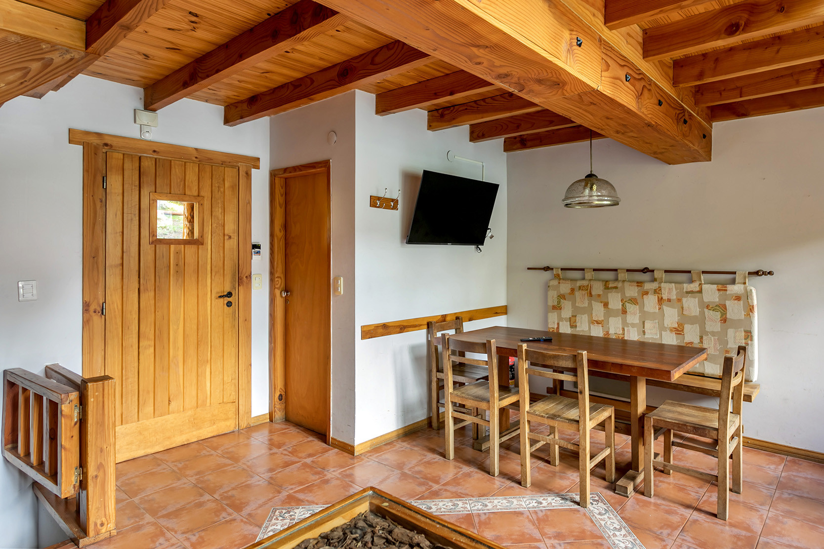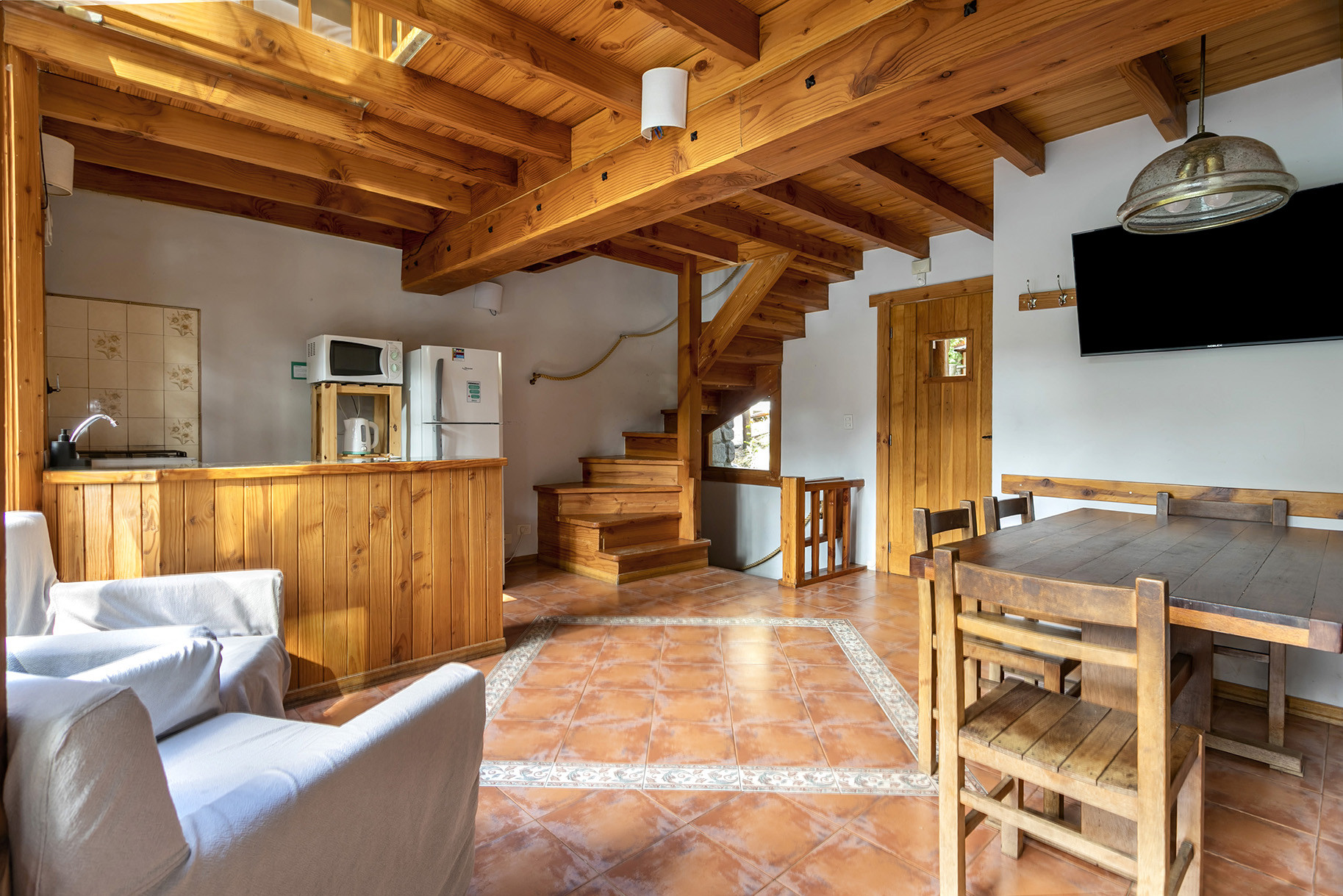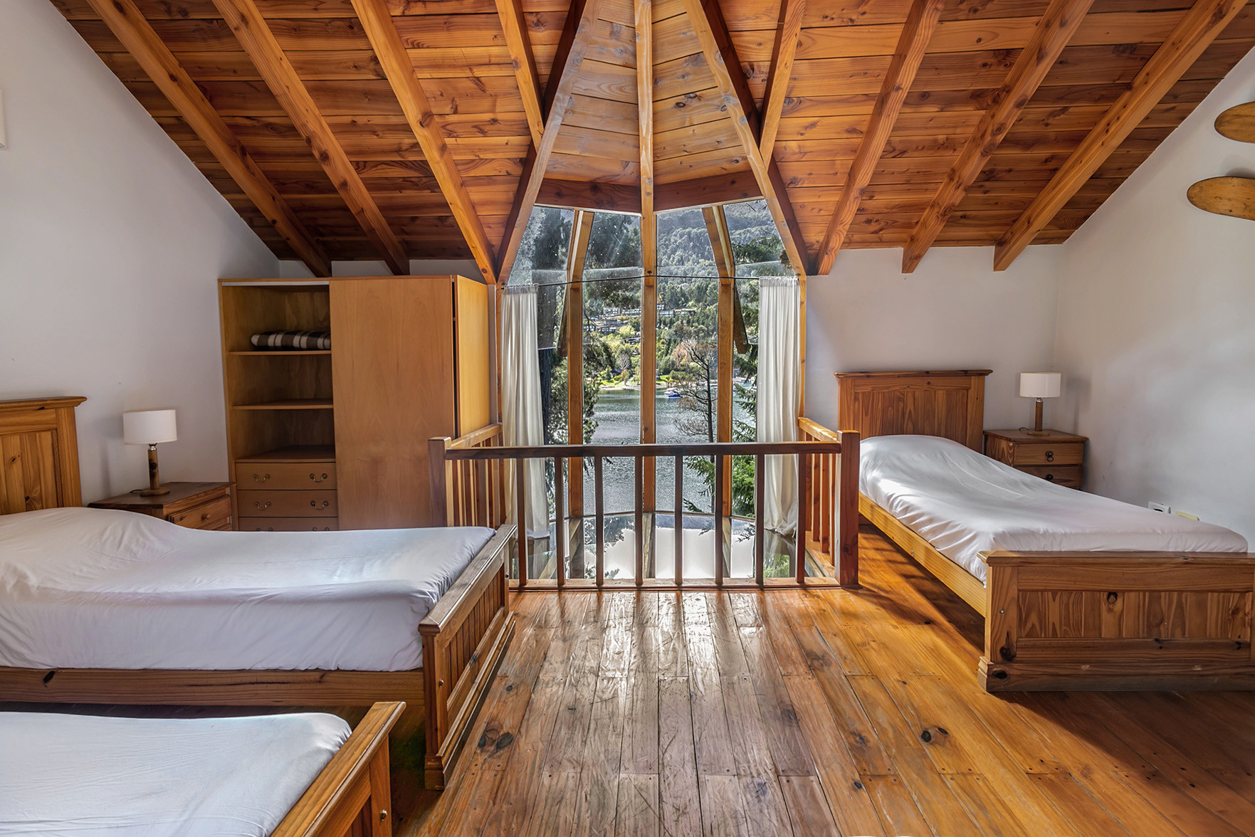 Esta acogedora cabaña en Villa La Angostura para 5 personas está diseñada en tres niveles. En el nivel principal, encontrarás un amplio comedor y cocina totalmente equipada, con una salida a la terraza donde podrás disfrutar de parrillas compartidas (chulengos) y vistas espectaculares al lago y la naturaleza. Bajando las escaleras, se encuentra el dormitorio principal con cama matrimonial, TV y acceso a un baño con jacuzzi, ideal para relajarse y apreciar el entorno. El último nivel ofrece una habitación con tres camas individuales, perfecta para grupos de amigos o familias que buscan una cabaña en alquiler en Villa La Angostura cómoda y con espacio.
