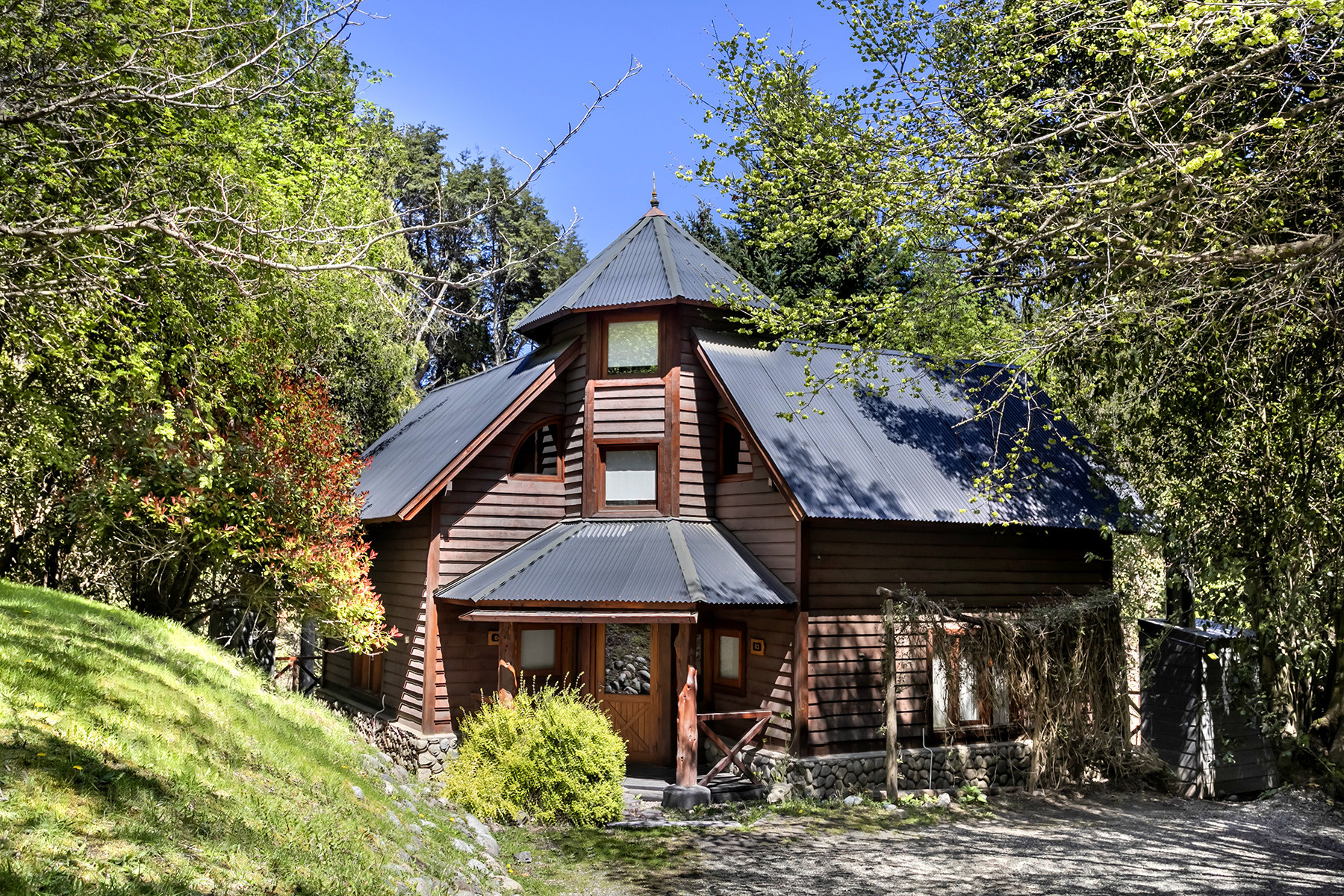 Escondida entre los árboles del exclusivo barrio de Puerto Manzano, esta cabaña de estilo patagónico ofrece un refugio cálido y confortable para disfrutar de la naturaleza en su máximo esplendor.
