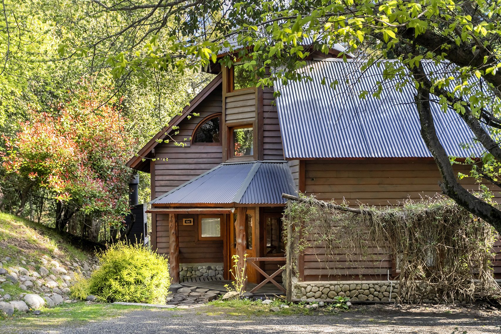 En el exterior, la cabaña tiene un deck con parrilla, perfecto para disfrutar de un asado en medio de la naturaleza. El complejo también cuenta con áreas comunes rodeadas de árboles nativos, creando un ambiente ideal para relajarse.