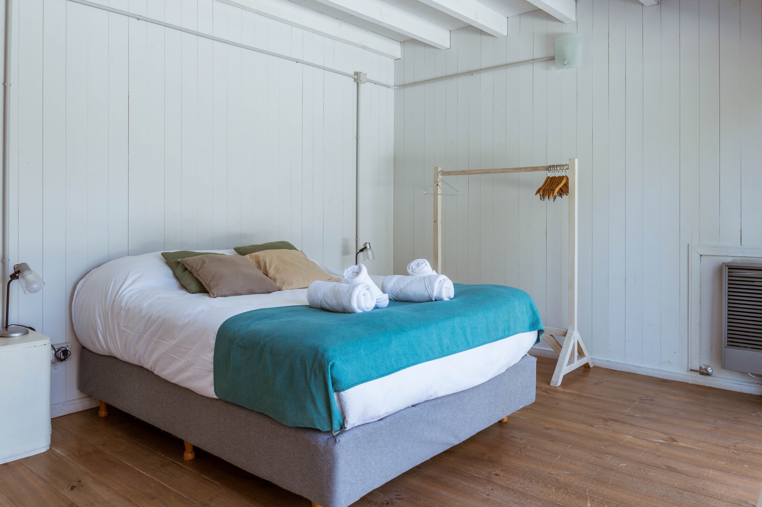 - Una habitación matrimonial con ventanales y vistas al jardín.