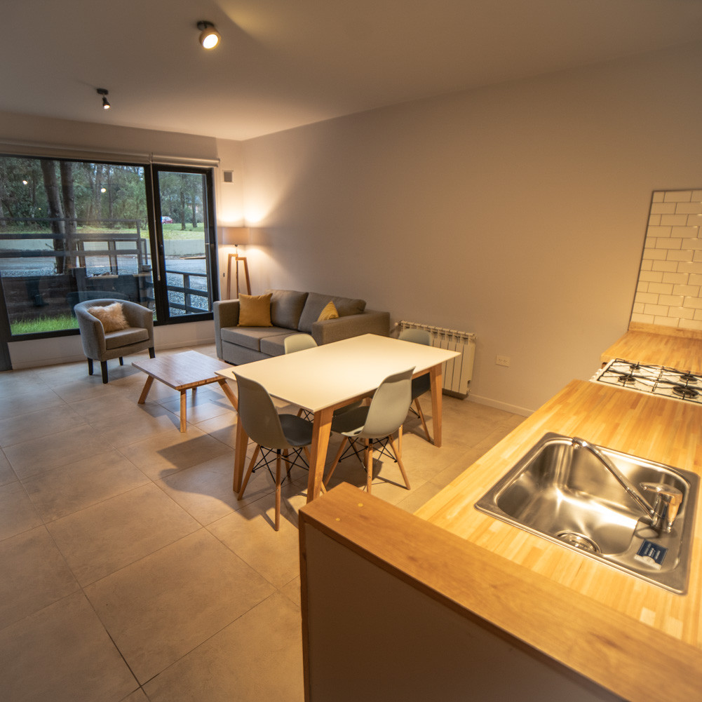 This modern accommodation in Villa La Angostura has a maximum capacity of 3 people. Upon entering, guests will go up to the second floor by stairs, where they will find a bright living room with a large window, a sofa bed and a Smart TV.