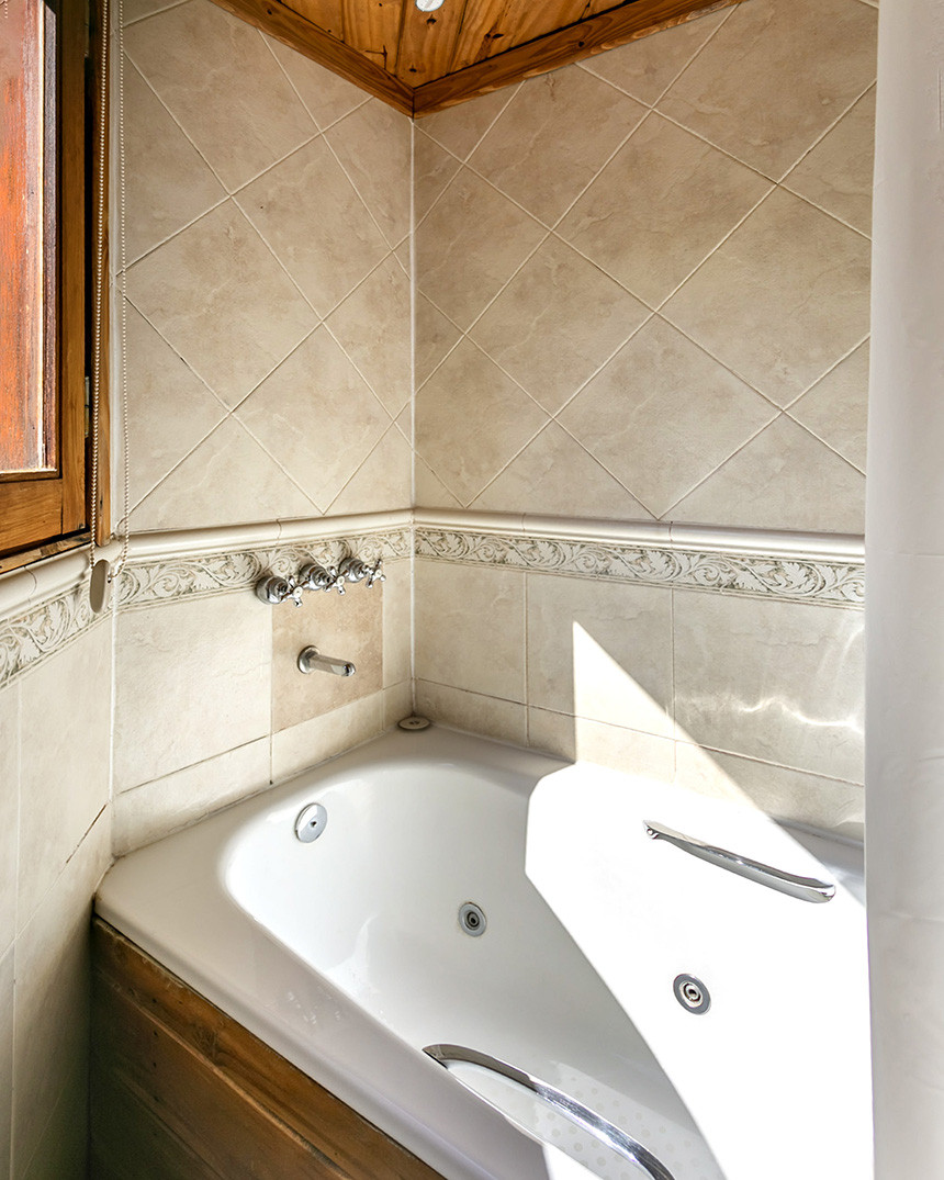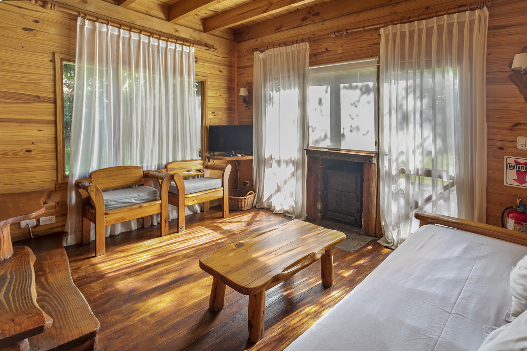 This bungalow-style cabin in Villa La Angostura is designed to provide comfort in every corner. The kitchen has a microwave, refrigerator, electric kettle, and all the necessary utensils for you to prepare your favorite meals. The heater is an individual gas boiler. The living room has a television, WiFi, and a relaxation area next to the fireplace, perfect for enjoying relaxing afternoons after a day of adventures.