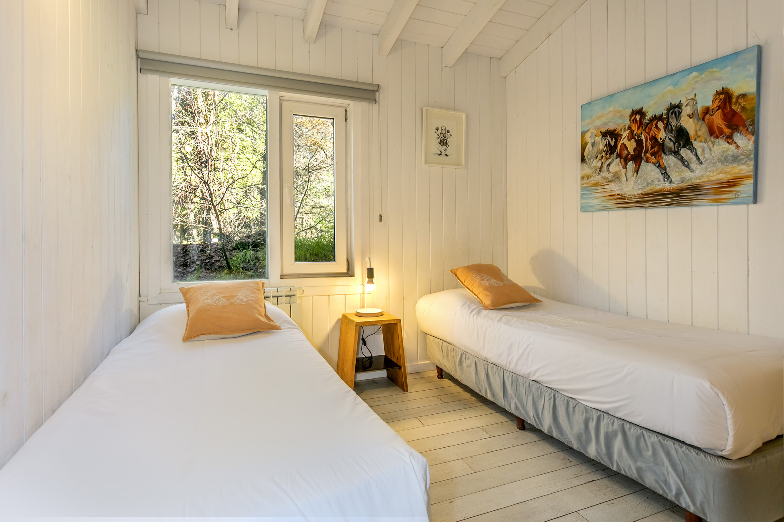 - Bedrooms: A master bedroom with a double bed and a view of the forest, and a second bedroom with two single beds (convertible to a double) and a wardrobe.