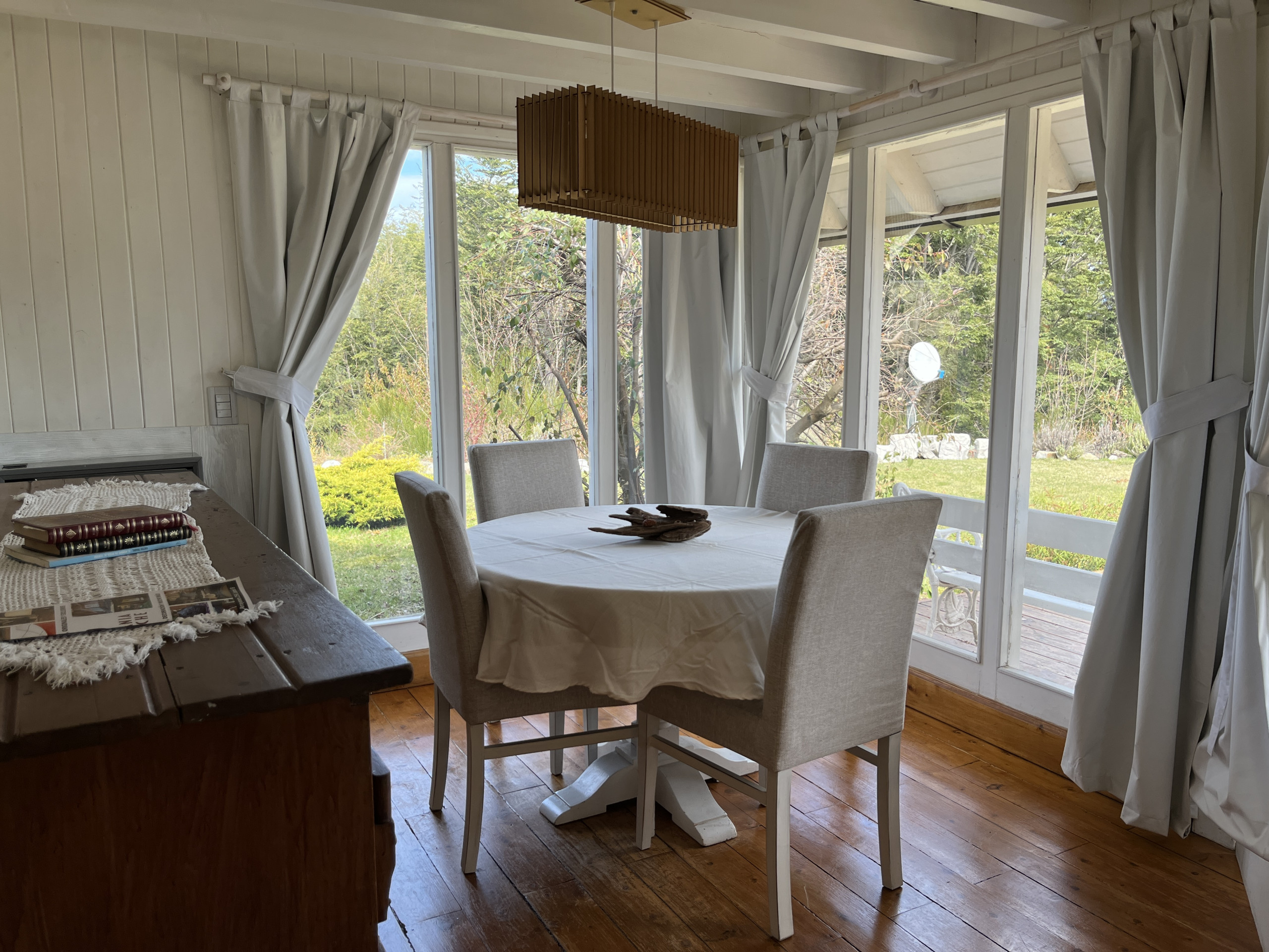 - Living-dining room: Spacious and bright, with large windows offering views of the garden. Includes an armchair for a fifth person.