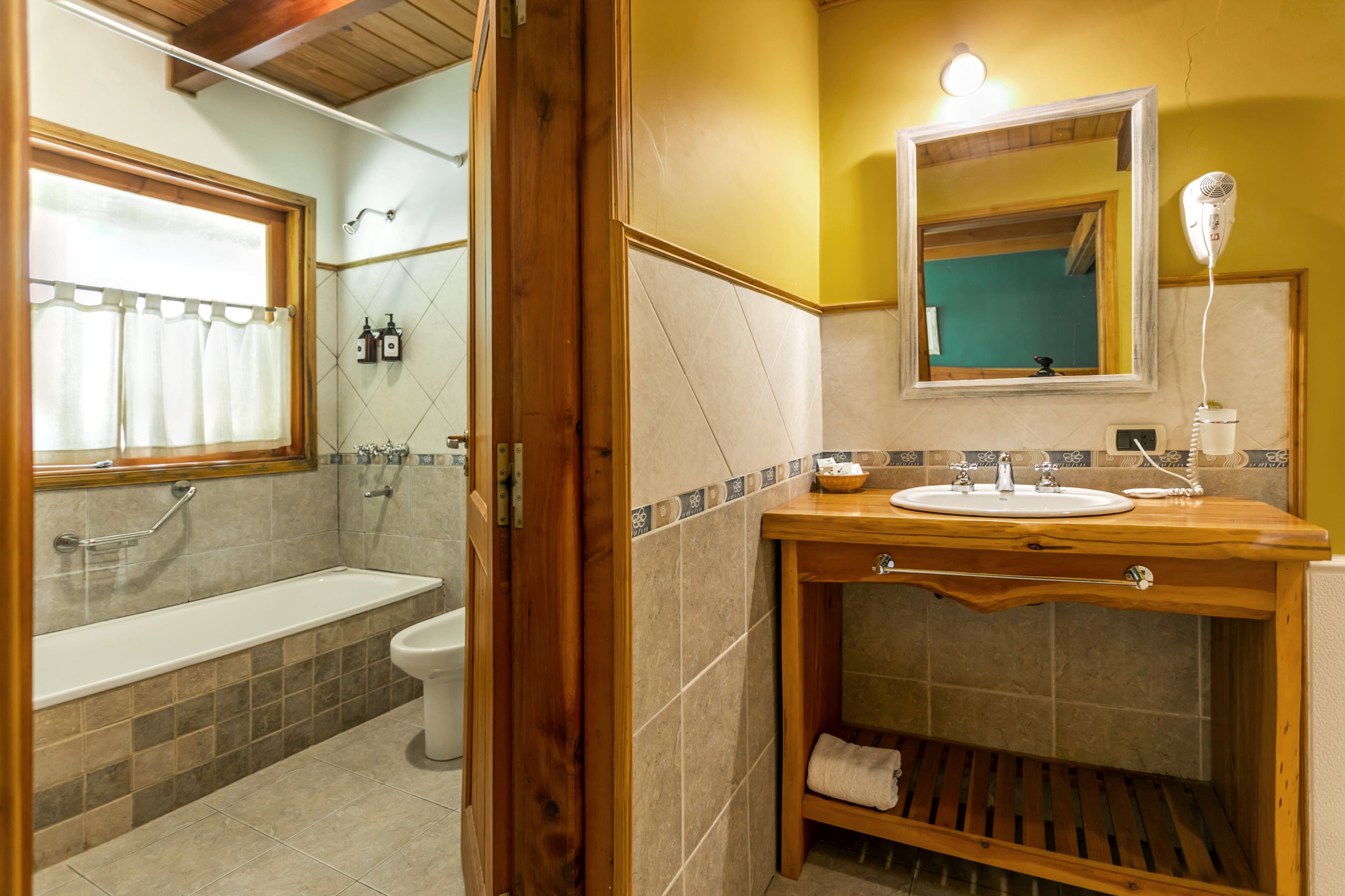 Conta com uma casa de banho completa com banheira, bidé e antecâmara com lavatório e secador de cabelo no piso do quarto, e uma casa de banho de cortesia com bidé no piso da sala de estar-jantar, o que proporciona maior comodidade e privacidade durante a estadia.