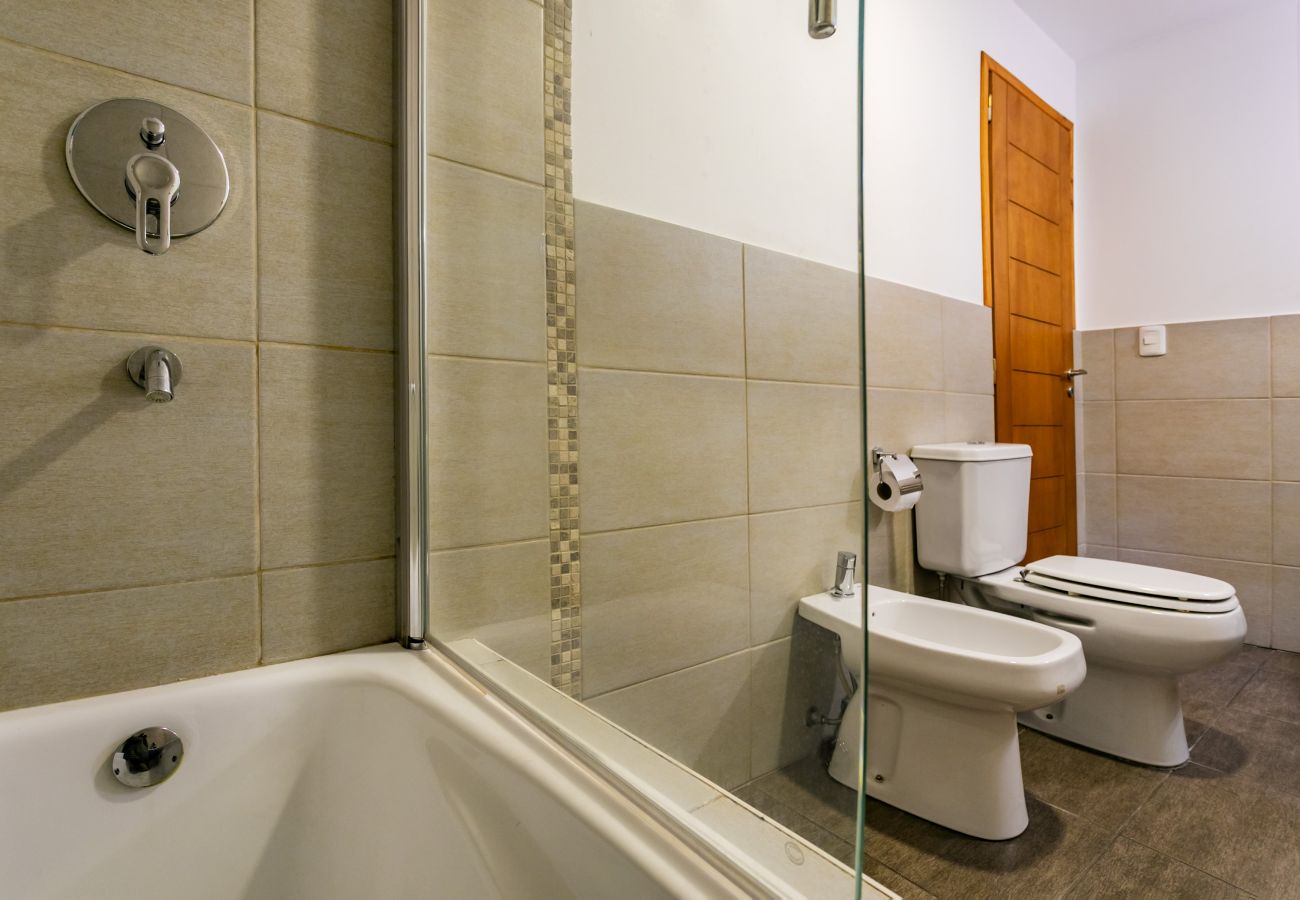 Este apartamento tipo apart hotel é perfeito para grupos de até 5 pessoas. O rés-do-chão possui uma sala de estar com futão-cama e TV. A cozinha equipada inclui forno elétrico, micro-ondas e utensílios completos. No andar superior, encontrará um quarto principal com cama de casal e outro com duas camas individuais. O banheiro está equipado com banheira e secador de cabelo.