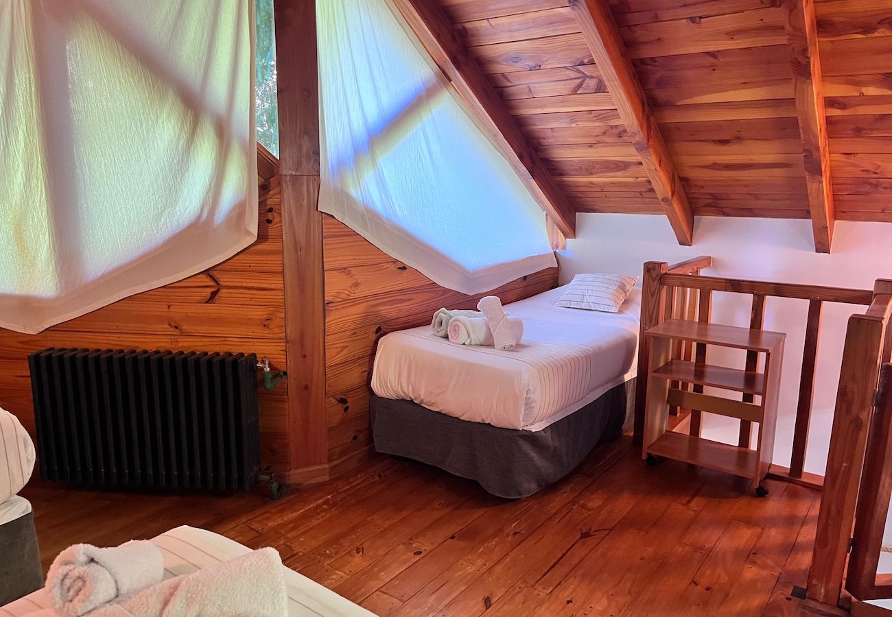 Este acolhedor chalé em Villa La Angostura para 5 pessoas está projetado em três níveis. No nível principal, encontrará uma ampla sala de jantar e cozinha totalmente equipada, com saída para a varanda onde poderá desfrutar de churrasqueiras compartilhadas e vistas espetaculares para o lago e a natureza. Descendo as escadas, encontra-se o quarto principal com cama de casal, TV e acesso a uma casa de banho com jacuzzi, ideal para relaxar e apreciar o ambiente. O último nível oferece um quarto com três camas individuais, perfeito para grupos de amigos ou famílias que procuram um chalé para alugar em Villa La Angostura confortável e espaçoso.