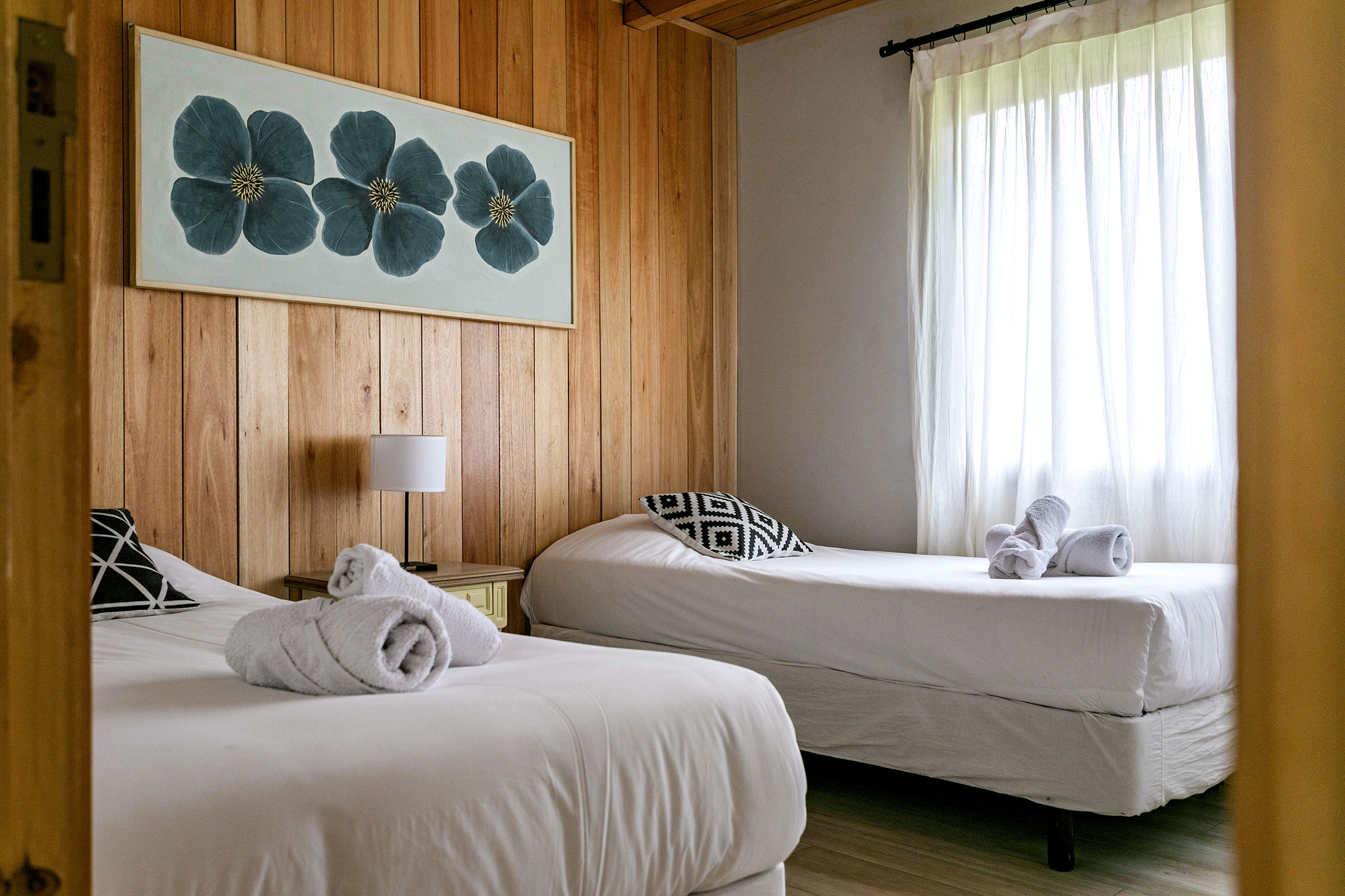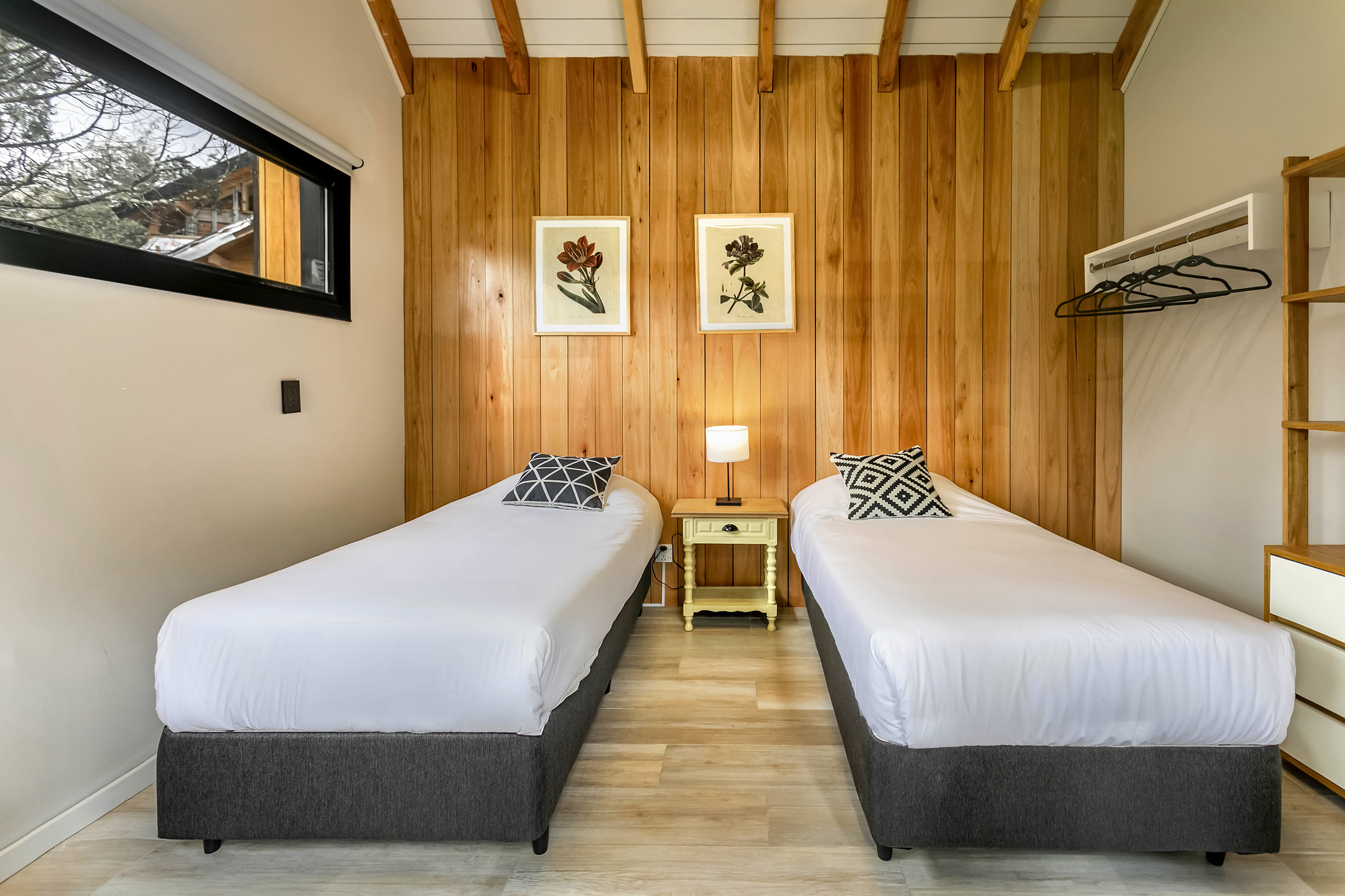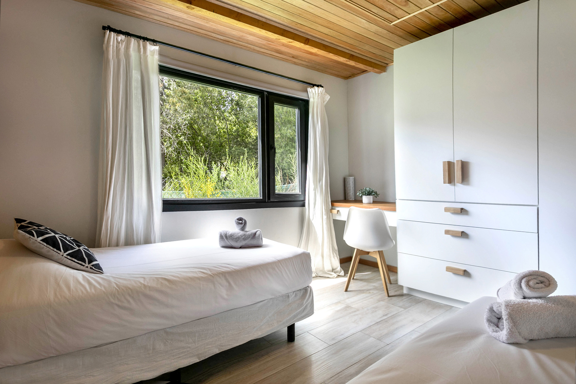- Um quarto secundário com duas camas individuais, armário e vista para a floresta.