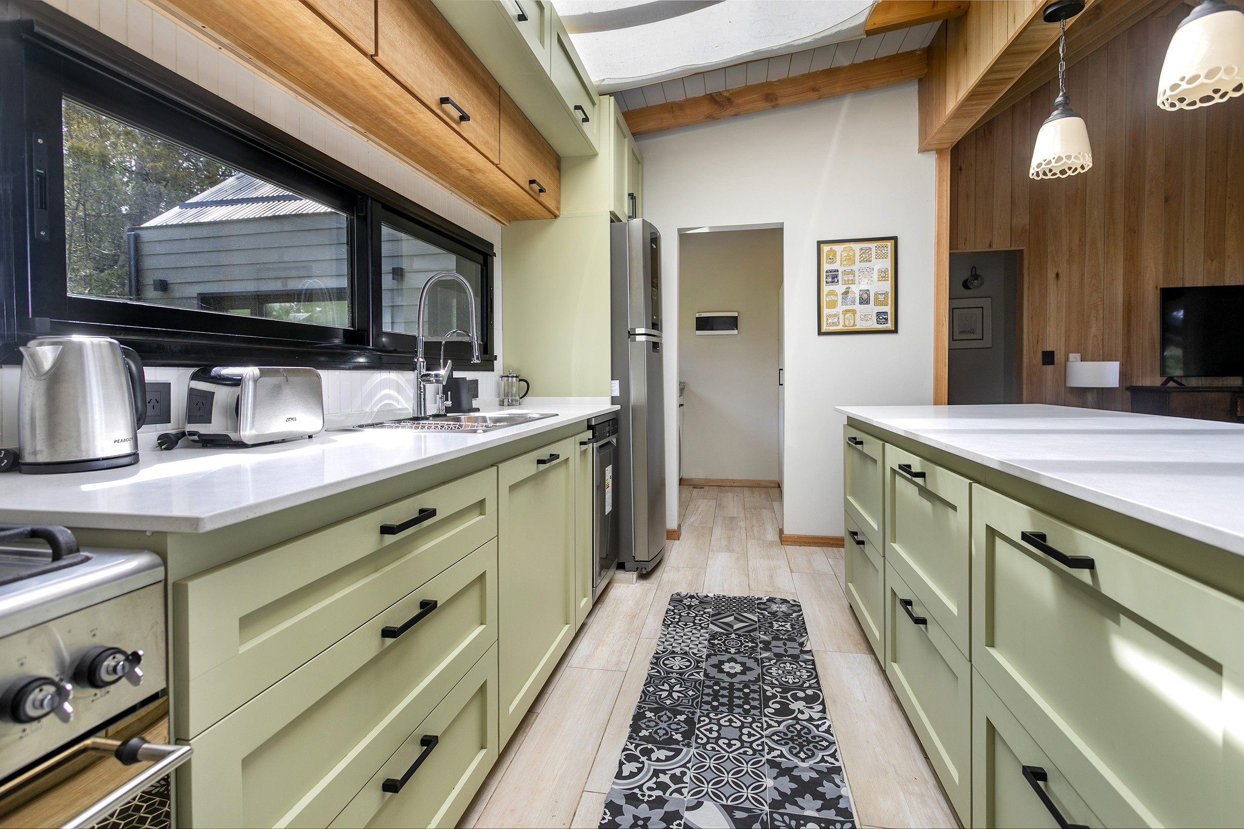 - Cozinha completa com eletrodomésticos modernos e utensílios de cozinha.