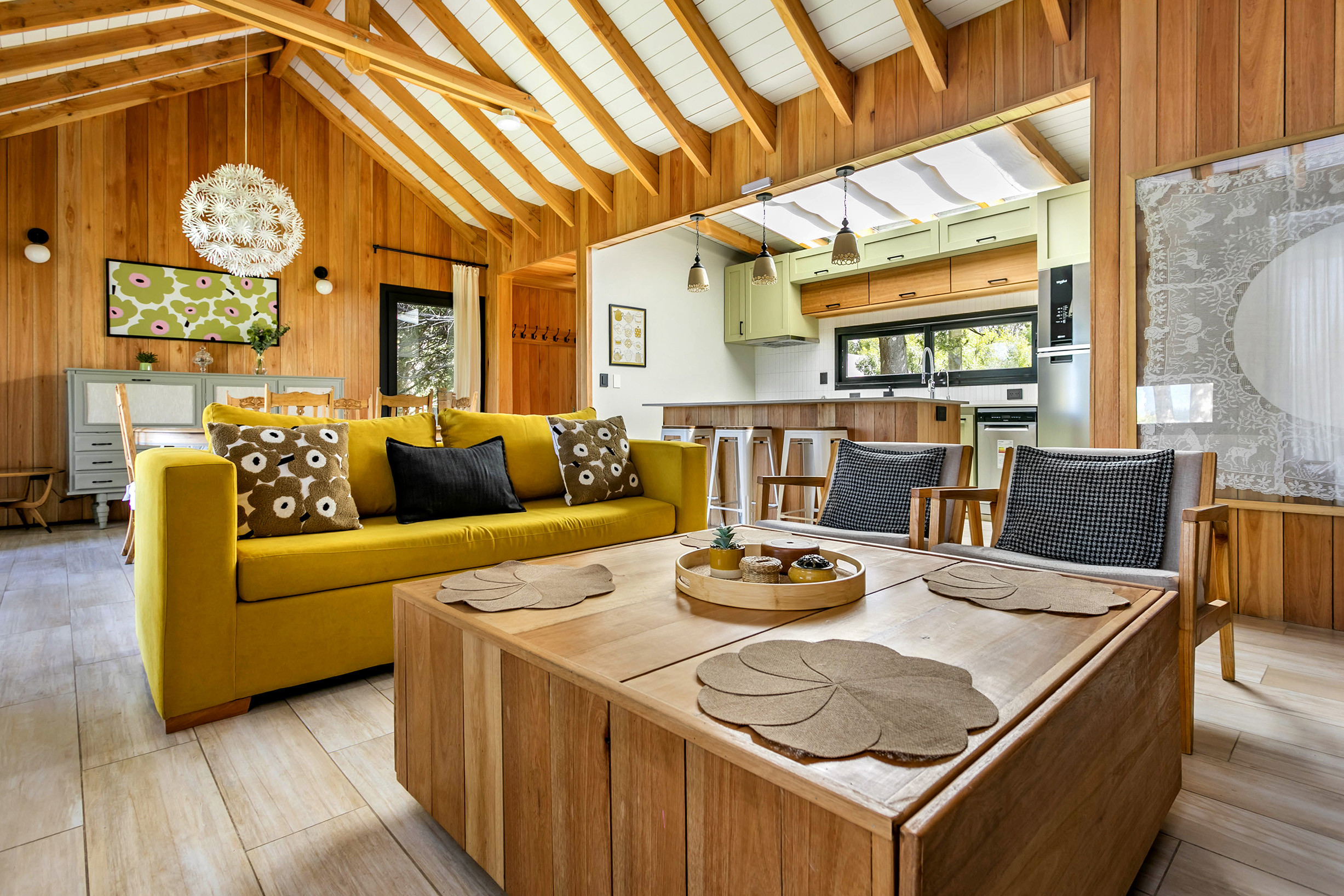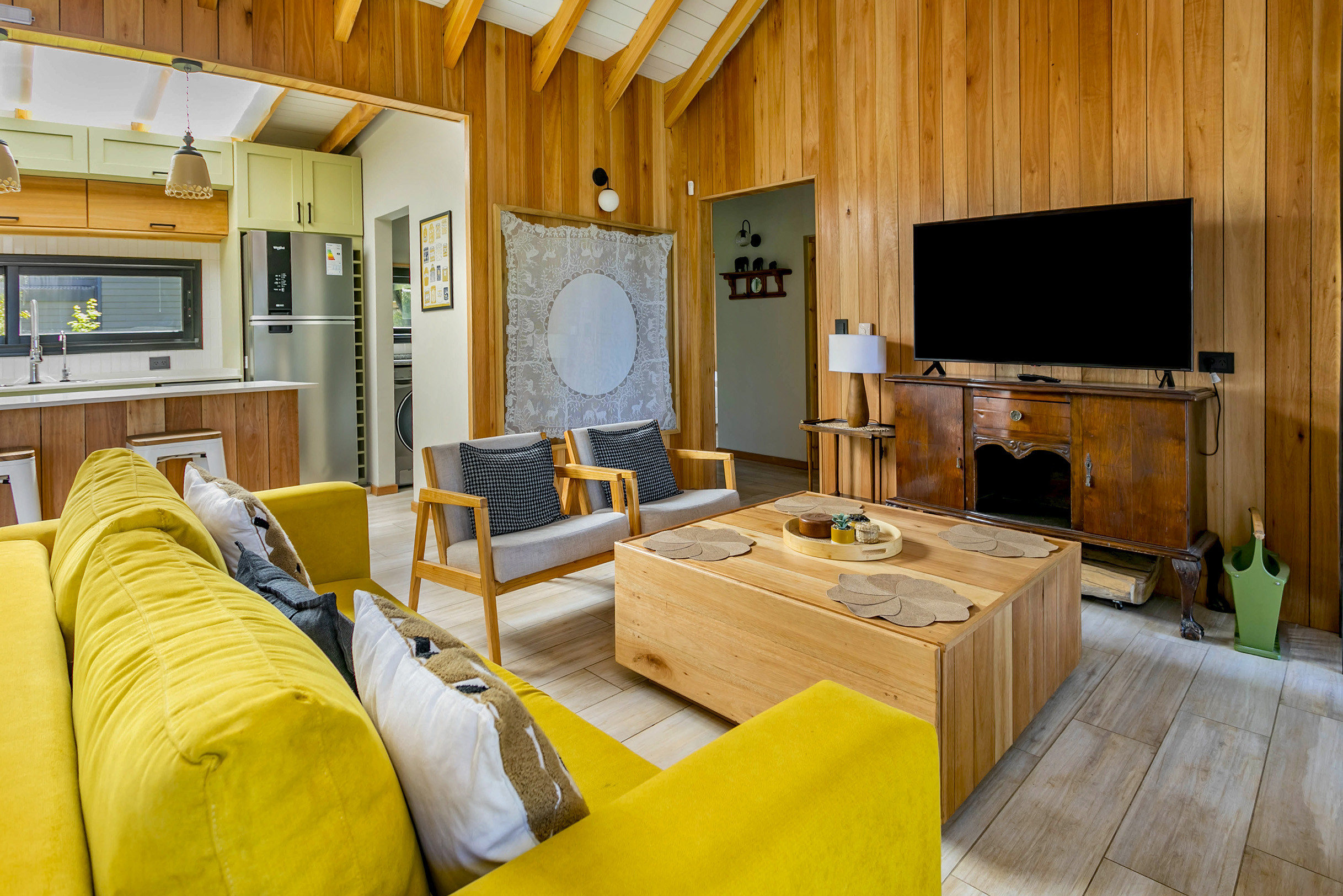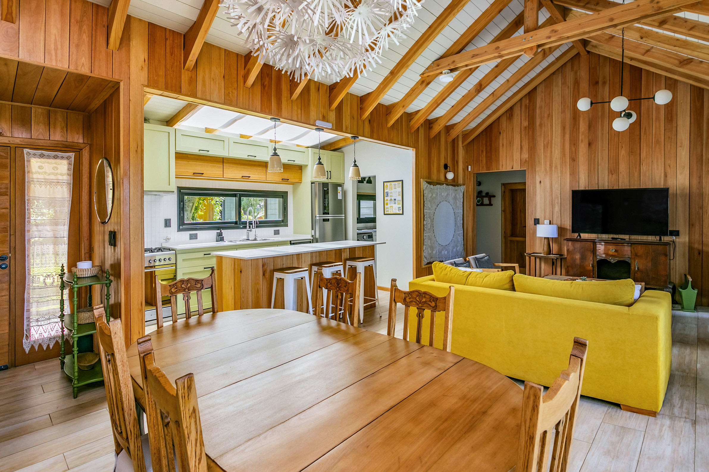 Com uma arquitetura moderna de inspiração escandinava, esta casa na natureza possui 90 m² distribuídos em um único andar, com capacidade para 4 pessoas. Ao entrar, você encontrará um ambiente integrado que combina sala de estar, sala de jantar e cozinha, proporcionando um espaço luminoso e acolhedor. A sala de estar inclui TV e confortáveis sofás, bem como uma mesa de trabalho para quem precisar trabalhar durante a estadia.
