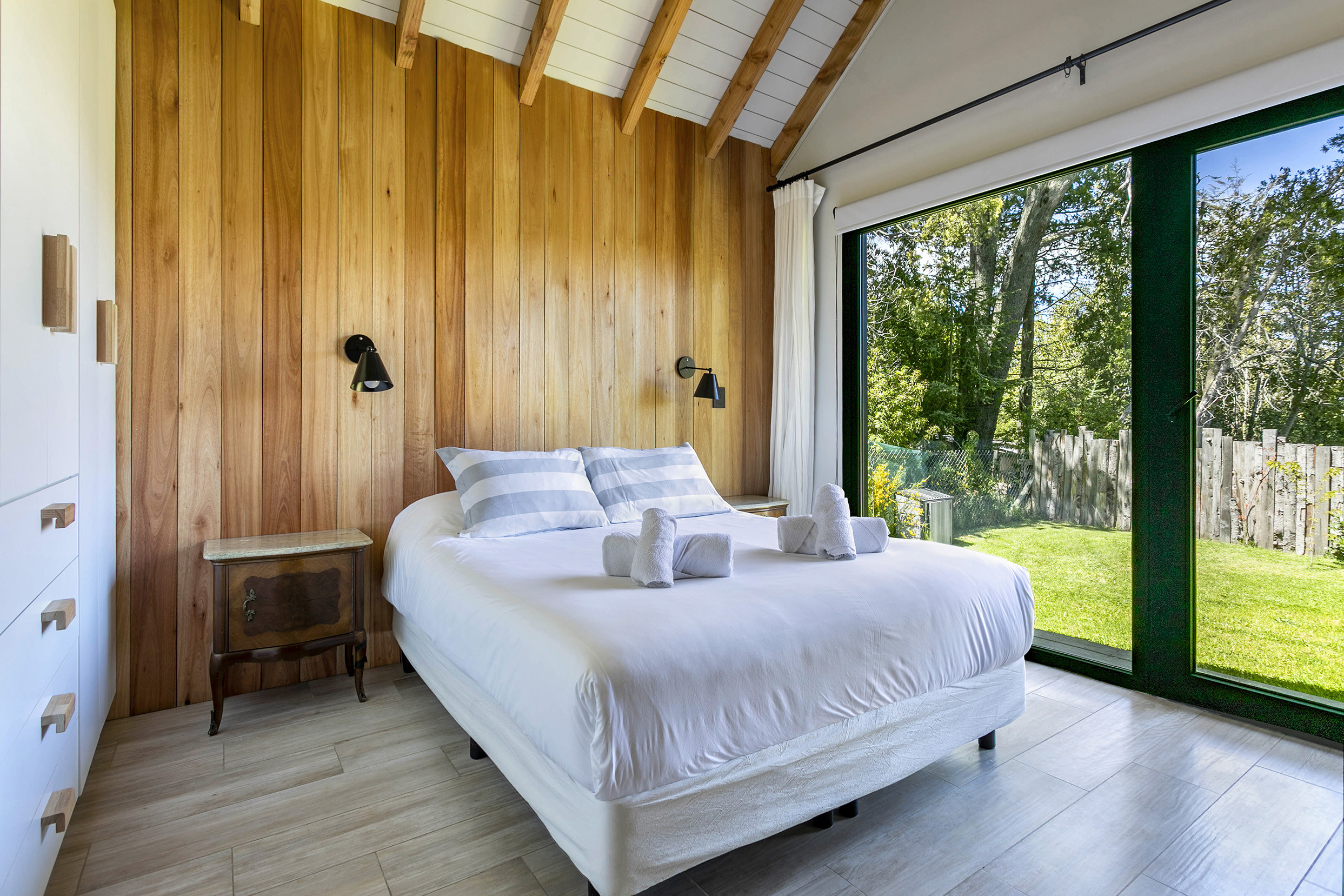 - Um quarto principal com cama de casal, armário e vista para o jardim.