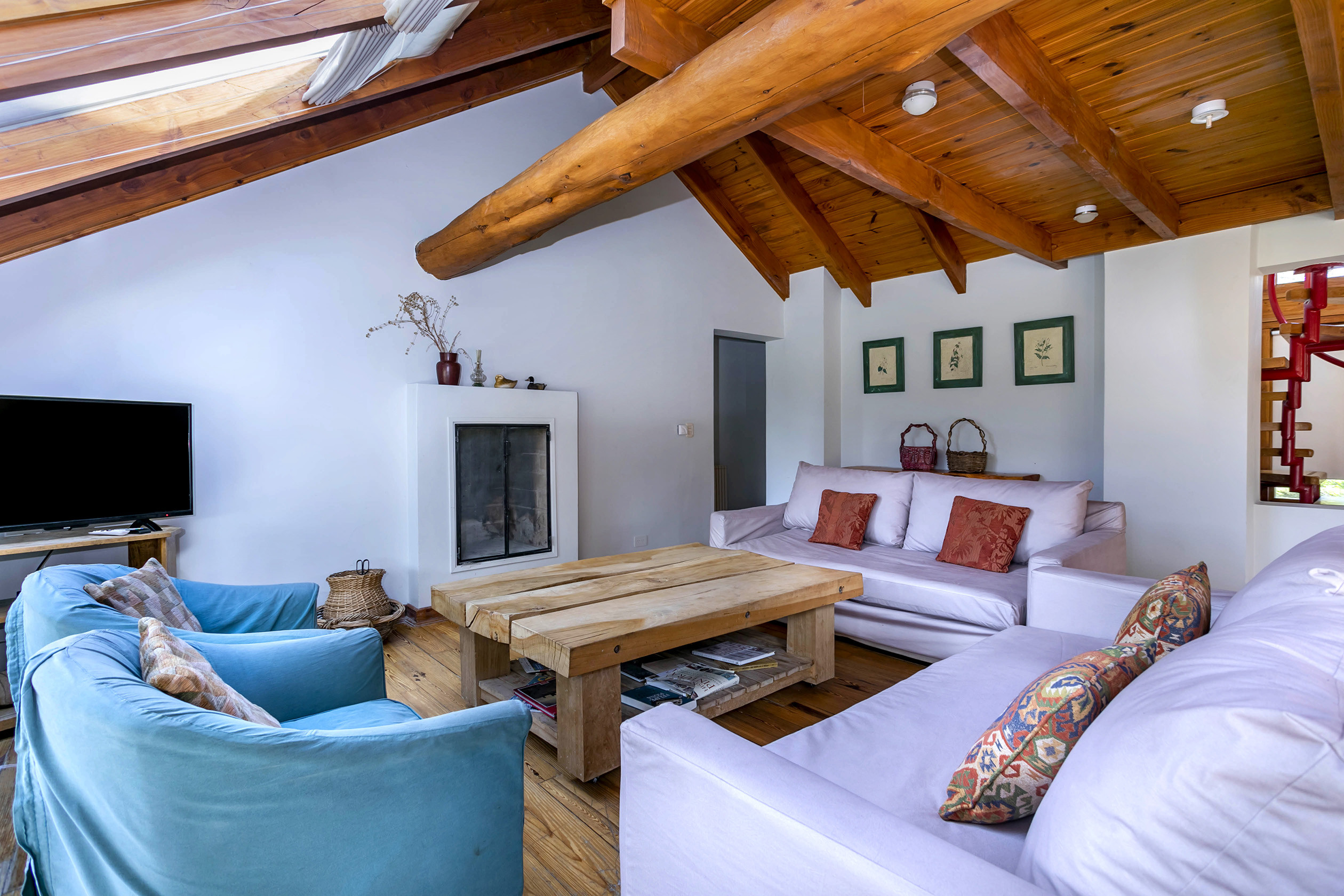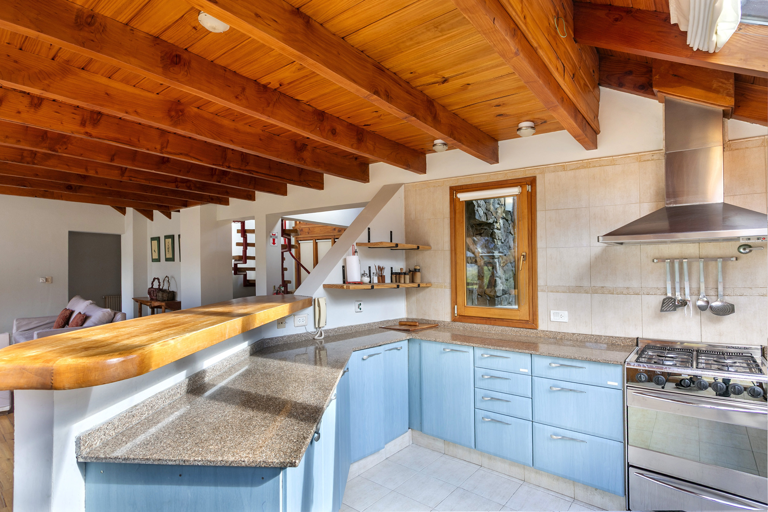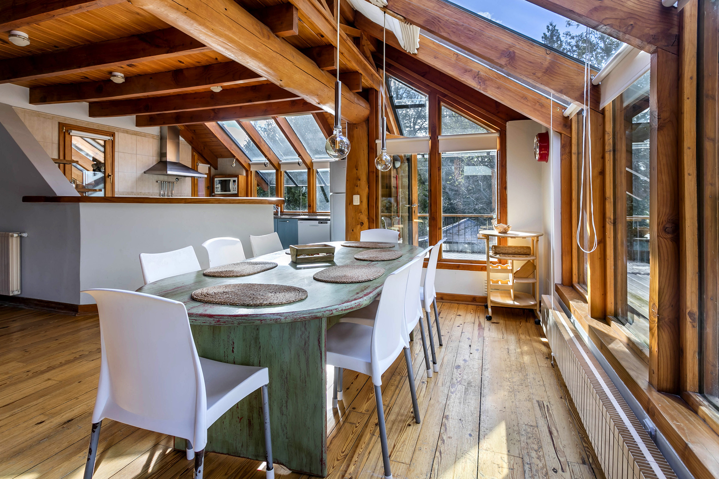 - Sala de estar-jantar com lareira a lenha e cozinha integrada totalmente equipada.
